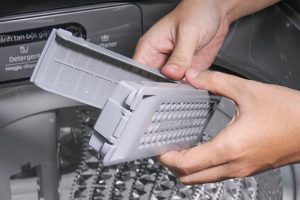 • Dùng bàn chải mềm rửa sạch rác, tóc, sợi vải rồi lắp lại đúng vị trí.