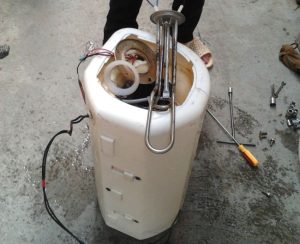 2. Xả nước & tháo các bộ phận: Tháo vỏ, thanh nhiệt, sợi đốt và các bộ phận cần làm sạch.
